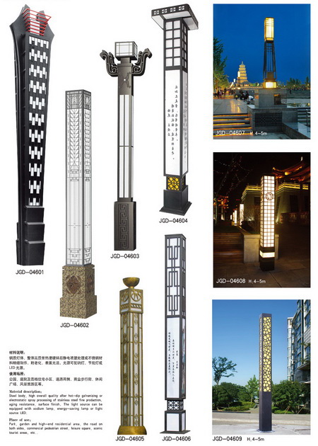 庭院燈分類:仿古庭院燈、現(xiàn)代功能性庭院燈、不銹鋼庭院燈、歐式庭院燈、砂鑄鋁庭院燈、壓鑄鋁庭院燈等各種特色庭院燈