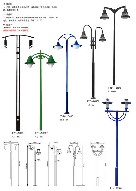 庭院燈是戶外照明燈具的一種,通常是指6米以下的戶外道路照明燈具,其主要部件由:光源、燈具、燈桿、法蘭盤、基礎(chǔ)預(yù)埋件5部分組成,因?yàn)橥ピ簾羝渚哂卸鄻有浴⒚烙^性具有美化和裝飾環(huán)境的特點(diǎn),所以也被稱之為景觀庭院燈。主要應(yīng)用于城市慢車道、窄車道、居民小區(qū)、旅游景區(qū),公園、廣場(chǎng)等公共場(chǎng)所的室外照明,能夠延長(zhǎng)人們的戶外活動(dòng)的時(shí)間,提高財(cái)產(chǎn)的安全。